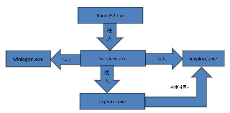此次瑞星公司公布的病毒分析報告顯示,“超級火焰”病毒的主體為一個名為MSSECMGR.OCX的DLL動態(tài)庫,通過命令行“rundll32.exe MSSECMGR.OCX, DDEnumCallback”來實現(xiàn)病毒的加載。病毒運行后會將自身復制到System32目錄下,并向services.exe、winlogon.exe、explorer.exe和iexplore.exe等程序中注入自身并實現(xiàn)加載。該病毒的注入流程如下圖所示。