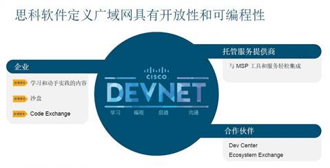 除了提供卓越的安全和應(yīng)用體驗外,思科SD-WAN還具備開放性與可編程性。曹圖強(qiáng)表示,“首先,思科將通過 DevNet 開發(fā)平臺向所有用戶開放API,為開發(fā)人員提供更大價值;其次,對合作伙伴而言,思科希望提供一個可交互的平臺幫助用戶進(jìn)行分享。任何用戶有特殊的需求,可以在DevNet 與大家分享。具體來說,在整個安全的廣域網(wǎng)部署中, IT人員可以通過開放的平臺,根據(jù)不同的環(huán)境和需求進(jìn)行二次開發(fā)!